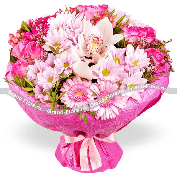 Стандартный: орхидея белая - 1 шт., хризантема кустовая ромашковая розовая - 3 шт., роза розовая - 5 шт., герберы розовые - 2 шт., гиперикум - 2 шт., декоративная зелень, упаковка, лента. Примерный размер: 30Х30 см.