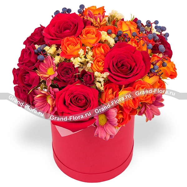 Букет собран из роз сорта Red France, отличающихся своим притягательным цветом, кустовых роз сорта Golden Perl, огненного оттенка и манящих красных кустовых роз , кустовые хризантемы, более светлого оттенка разбавляют розарий, а вкрапления гиперикума и статицы идеально завершают картину.Композиция выполнена в шляпной коробке на оазисе. Диаметр композиции от 20см до 30см. Обращаем Ваше внимание, что состав и оформление может отличаться.