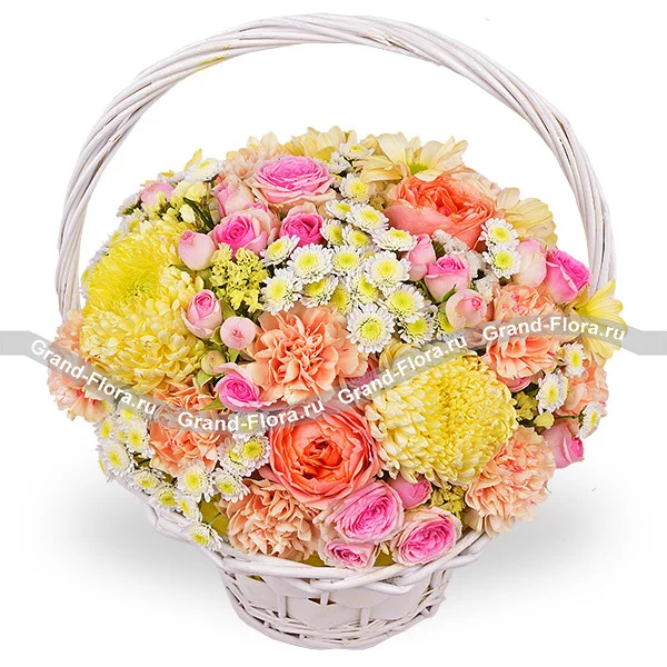 Стандартный: роза розовая - 1 шт., роза персиковая - 1 шт., хризантема одноголовая желтая - 1 шт., гвоздика персиковая - 6 шт., хризантема сантини - 4 шт., роза кустовая розовая - 1 шт., хризантема кустовая ромашковая желтая - 1 шт., оазис, корзина средняя.