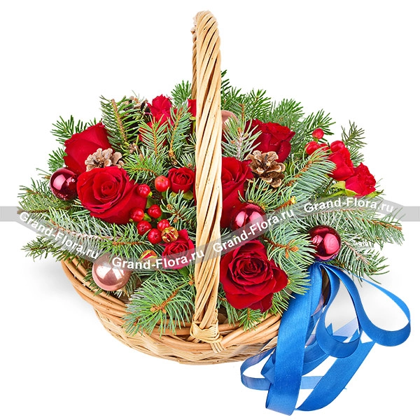 Уменьшенный: роза красная - 3 шт., роза кустовая красная - 2 шт., шишка - 1 шт., гиперикум - 1 шт., новогодний декор, ель, оазис, корзина, лента.