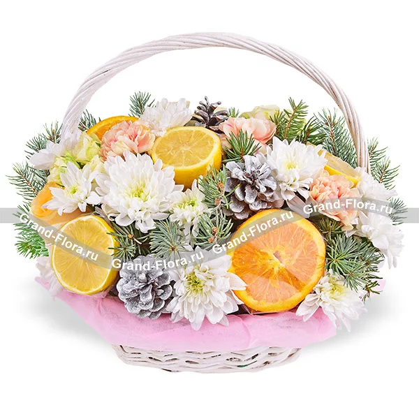 Снежный день - корзина с хризантемами и лимонами
