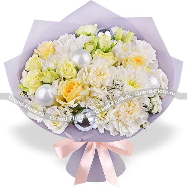 Стандартный: роза желтая - 2 шт., роза кустовая кремовая - 2 шт., эустома белая - 2 шт., хризантема кустовая белая - 3 шт., гвоздика белая - 2 шт., статица, новогодний декор., упаковка, лента.