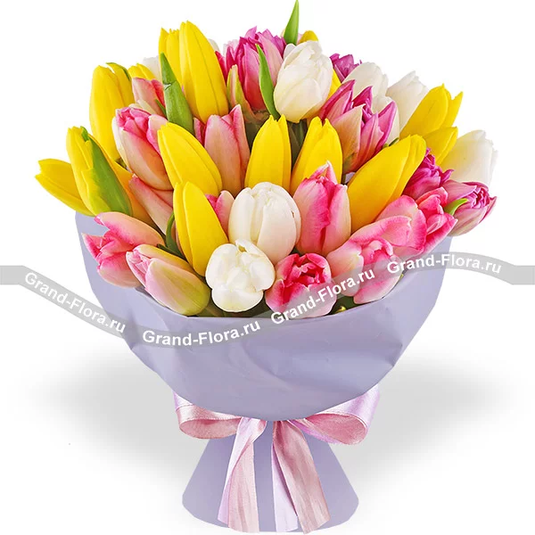 51 тюльпан: разноцветные тюльпаны (фиолетовые, розовые, белые, желтые) - 51 шт., упаковка, лента.