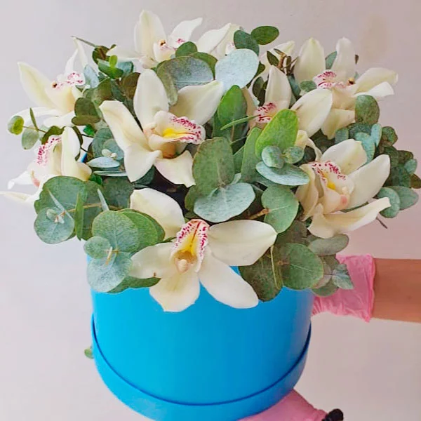 Стандартный: орхидея белая - 7 бутонов, эвкалипт, оазис, коробка. Примерный размер: 25Х30 см.