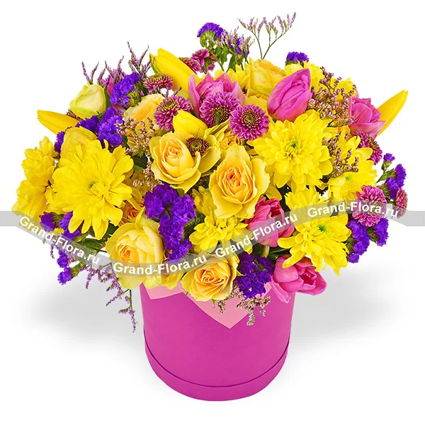 Стандартный: роза кустовая желтая - 4 шт., тюльпан желтый - 4 шт., хризантема кустовая желтая - 4 шт., тюльпан розовый - 6 шт., хризантема кустовая фиолетовая - 1 шт., лимониум, статица, оазис, коробка. Примерный размер: 25Х35 см.