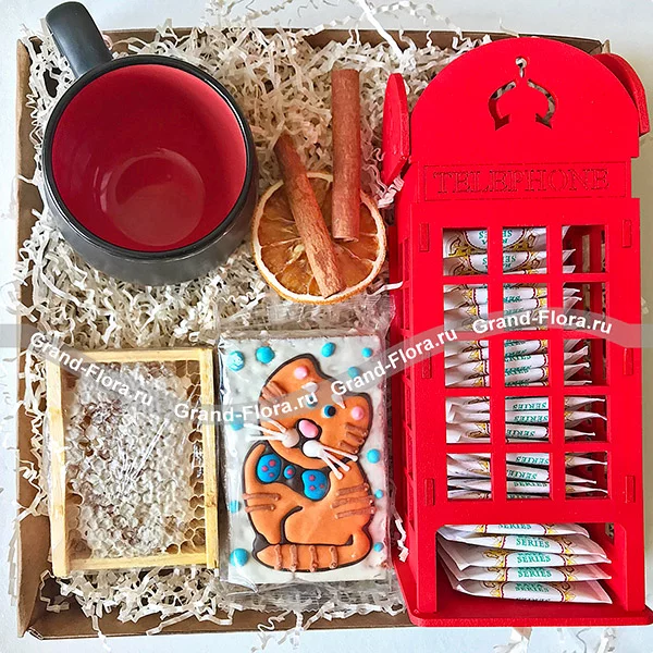 Стандартный: подставка под чайные пакетики в виде телефонной будки в английском стиле - 1 шт., чашка - 1 шт., чай в пакетиках - 1 упаковка, Покровский пряник - 1 шт., мед/медовые соты - 1 шт., подарочная коробка - 1 шт., наполнитель, декор (палочки корицы, сухофрукты).