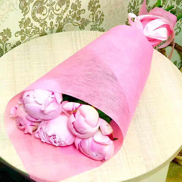 5 пионов: пионы сиреневые- 5 шт., упаковка, лента.