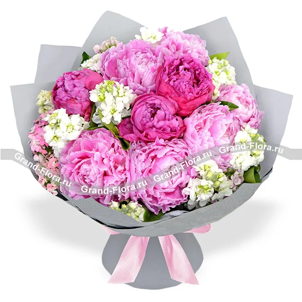 Стандартный: пион розовый - 6 шт., пион малиновый - 3 шт., микс матиолы (белая и розовая) - 8 шт., упаковка, лента.