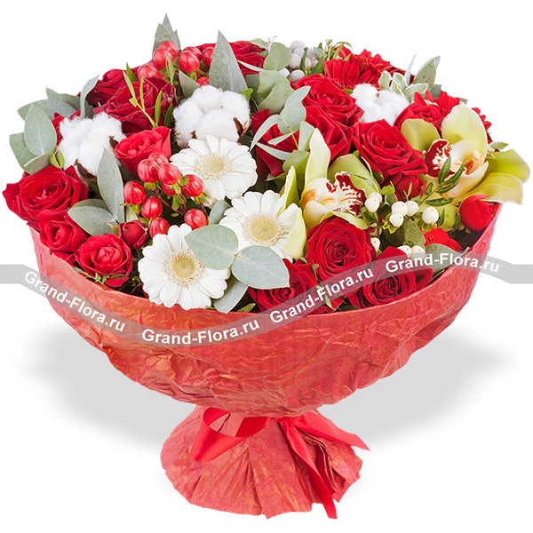 Стандартный: орхидея зеленая - 1 шт., роза красная - 4 шт., роза кустовая красная - 2 шт., гербера белая - 2 шт., гербера красная - 2 шт., гиперикум, декоративная зелень, хлопок, упаковка, лента.