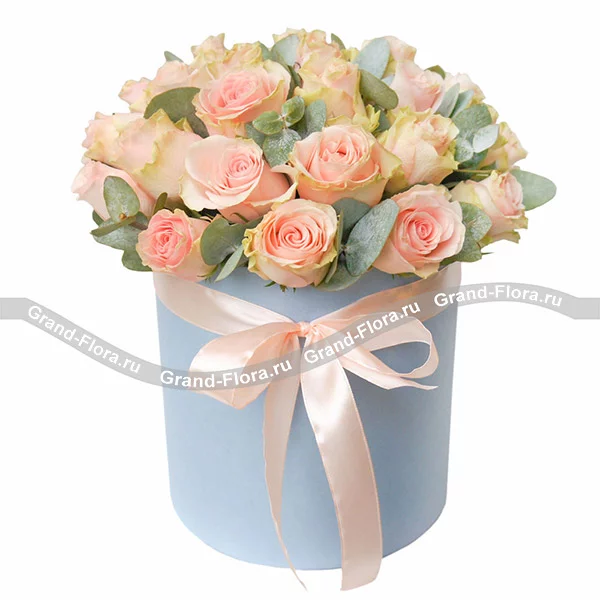 25 роз: роза розовая (Россия) 50 см.,- 25 шт., коробка круглая средняя (20*30) - 1 шт., эвкалипт, оазис.