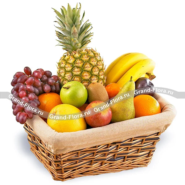Стандартный (на фото): ананас - 1 шт., яблоки - 0,7 кг., виноград - 0,7 кг, апельсины - 1 кг., лимон - 2 шт., киви - 3 шт., груши - 0,5 кг., слива - 3 шт., бананы - 0,7 кг., корзина.
