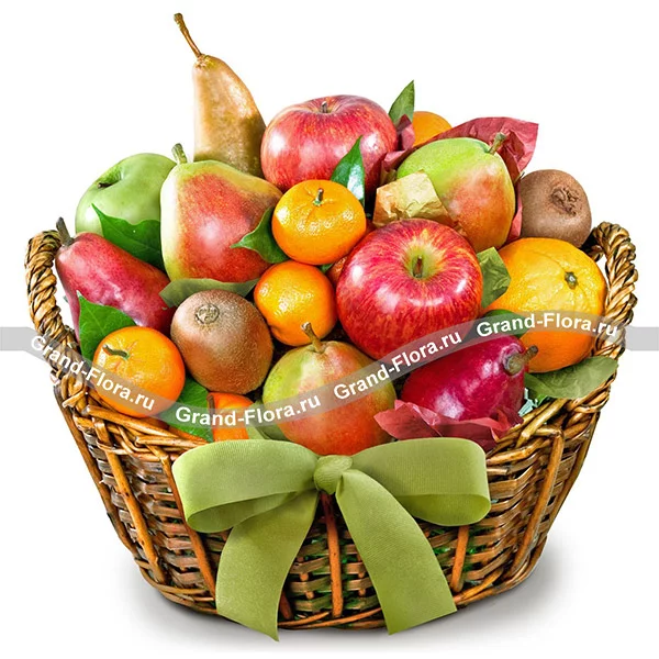 Стандартный: яблоки - 0,7 кг., груши - 0,7 кг, киви - 4 шт., мандарины (возможна замена на апельсины) - 0,7 кг., корзина, бант.