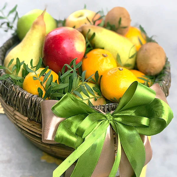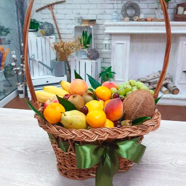Что за сюрприз сможет сравниться со спелыми и ароматными фруктами? Вы можете подарить своим близким полезный и вкусный подарок, который будет оригинальным и уместным по абсолютно любому поводу. Отличное дополнение к праздничному столу, дружеским посиделкам или, как знак внимания для дорогого Вам человека. Корзинка наполнена яблоками и грушами, апельсинами и киви, в общем, всем тем, что так любят и взрослые и дети.