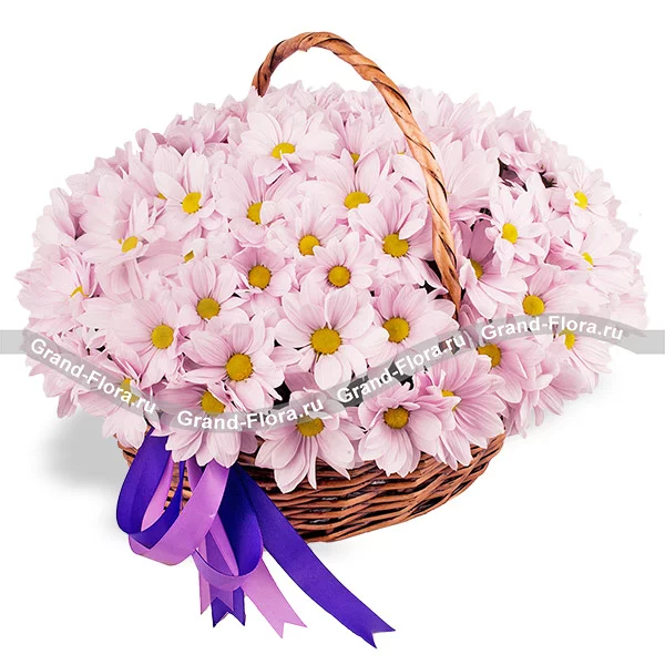 хризантема кустовая ромашковидная розовая - 25 шт., оазис, лента, корзина большая.