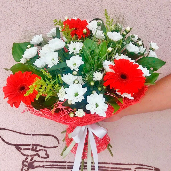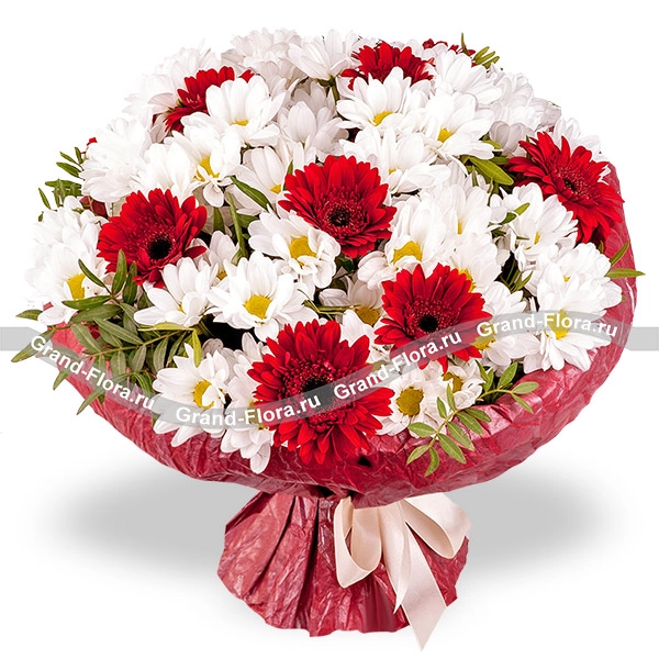 Стандартный (на фото): хризантема кустовая белая - 7 шт., гербера красная - 8 шт., декоративная зелень, упаковка, лента. Примерный диаметр букета 30х30 см.