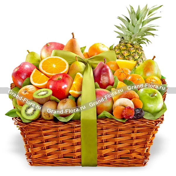 Стандартный: ананас - 1 шт., апельсины - 500 гр., груши - 500 г., яблоки красные -500 гр., яблоки зелёные - 500 гр., мандарины - 500 гр., манго - 1 шт., киви - 500 гр., сухофрукты смесь - 100 гр., лента, корзина, целлофан.
