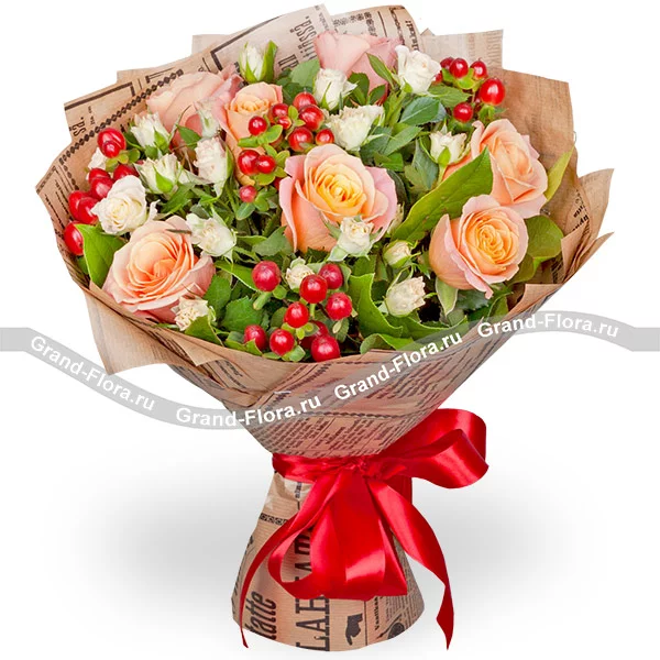 Стандартный(на фото): роза персиковая - 7 шт., роза кустовая белая - 4 шт., гиперикум красный - 4 шт., декоративная зелень, упаковка крафт, лента.