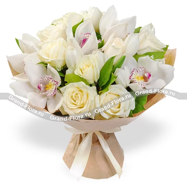 Стандартный: роза белая - 7 шт., орхидея - 4 шт., декоративная зелень, коробка упаковка крафт.