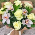 Люкс: роза белая - 11 шт., орхидея - 6 шт., декоративная зелень, коробка упаковка крафт.