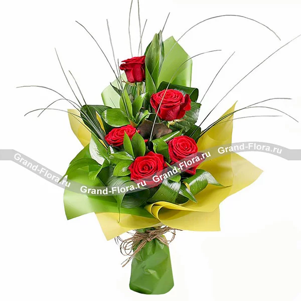 Рускус (3 шт.), Роза красная (5 шт.), Упаковка, Аспидистра (3 шт.), Берграсс, Лента