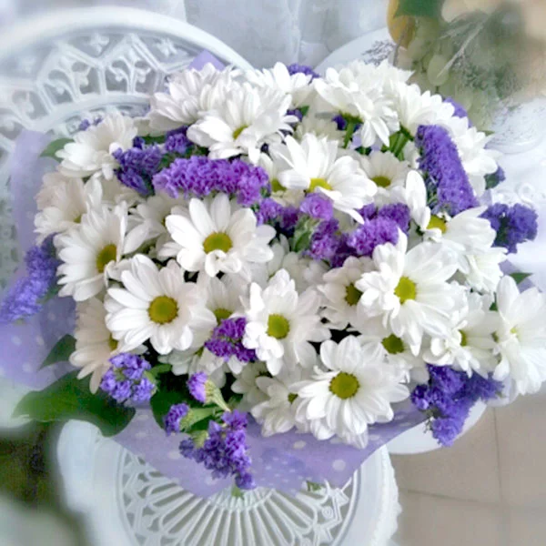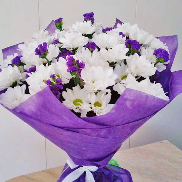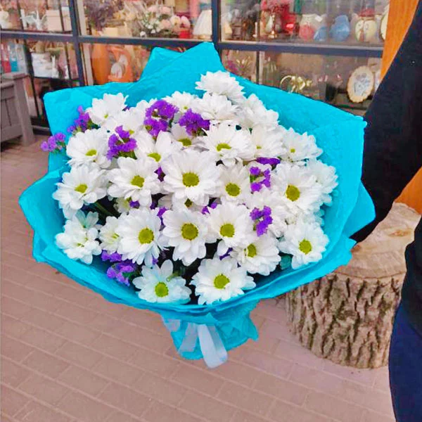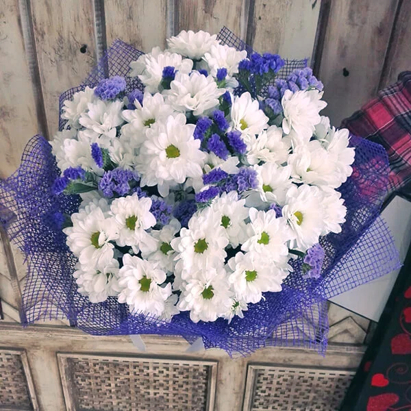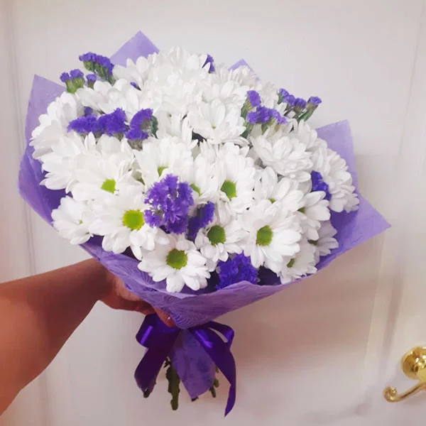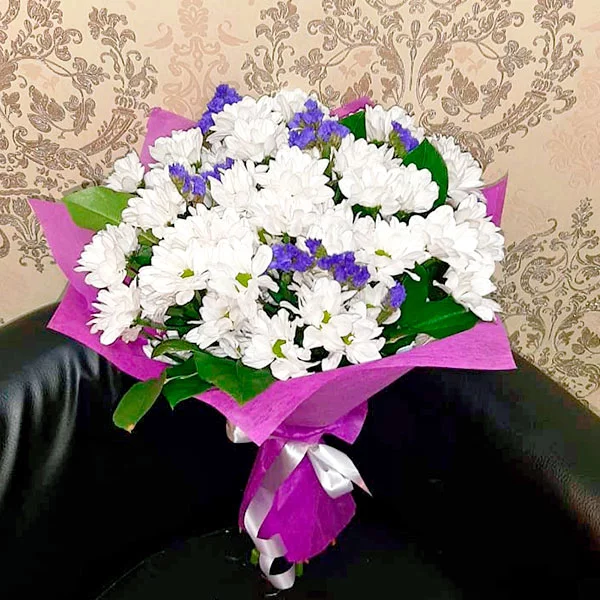Букет из элегантных белых кустовых хризантем – само олицетворение нежности и женственности. Такой изысканный комплимент даст девушке почувствовать себя прекрасной богиней!