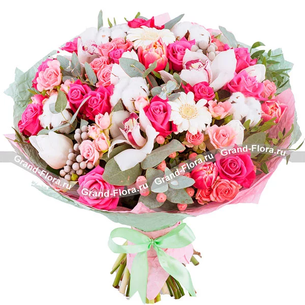 Стандартный: Роза розовая одноголовая – 7 шт,Роза розовая кустовая – 4 шт., Тюльпан розовый -  3 шт.