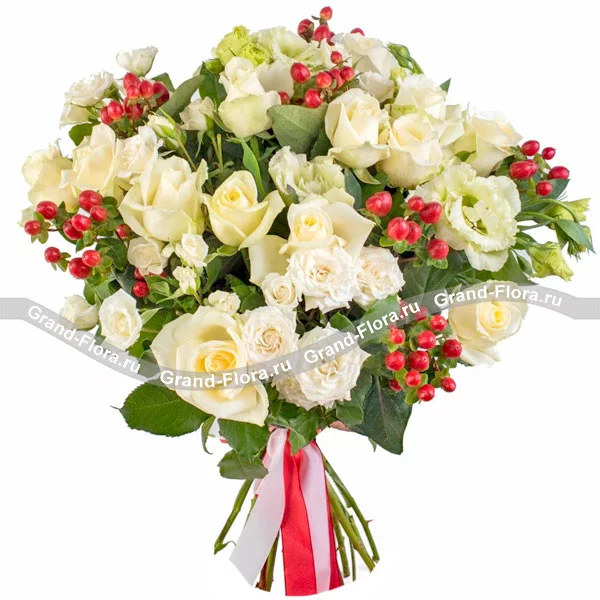 Букет, который покорит и растопит своей невероятной нежностью даже самое холодное сердце! Элегантен и прост, он очаровывает с первого взгляда. Классические ванильно-белые розы сочетаются здесь с легкой и воздушной кустовой розой в светлом оттенке, а дополняет композицию великолепнаяя эустома. Такой цветочный аккорд звучит свежо и привлекательно! Букет  дополнене декором и перевязан лентой.