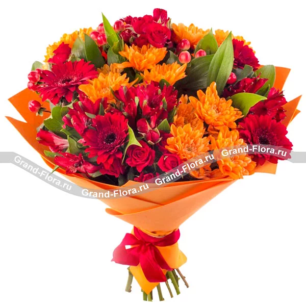 Цветочная мелодия - смешанный букет из хризантем, гербер и кустовых роз