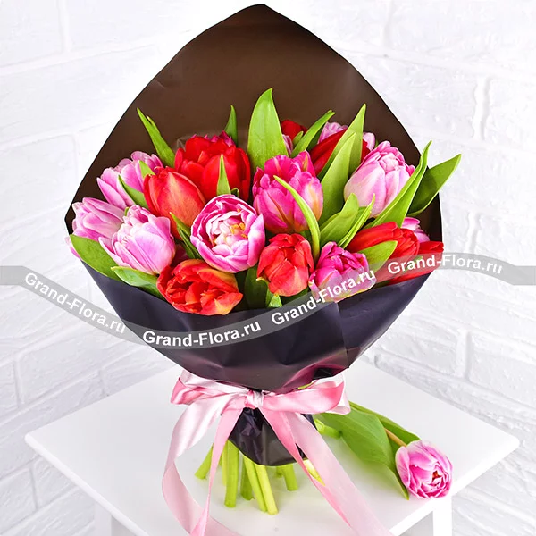 11 тюльпанов: розовые и красные тюльпаны - 11 шт., упаковка, лента.