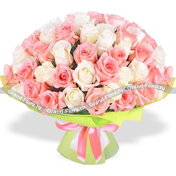 Классический вариант букета для подарка дорогому человеку или на долгожданное торжество. Нежно –  розовые и белые розы, символизирующие искренность и чистоту намерений. Воплощение стиля, изысканной элегантности и дорогой простоты.