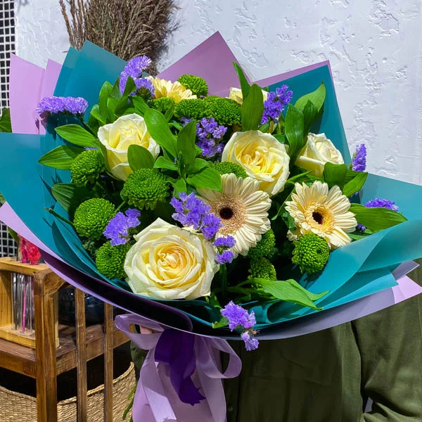 Нежную композицию, составленную из светлых роз и гербер, превосходно подчеркивает кустовая зеленая хризантема. Особое очарование и выразительность придает статица. Яркий фиолетовый букет великолепно подойдет для того, чтобы поздравить коллегу с дня рождения или любым другим торжеством.