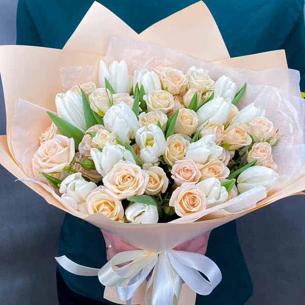 Нежность в лепестках - букет из белых тюльпанов и кустовой розы