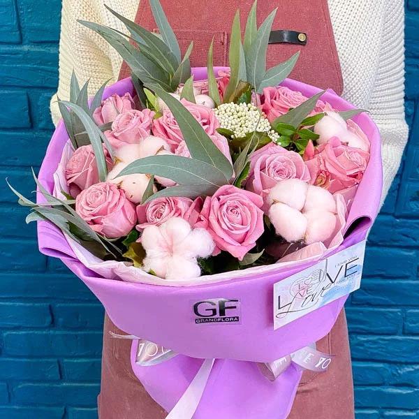 "Розы в этом букете излучают нежность и любовь, они символизируют чувства и идеально подходят для выражения признания или извинения. Сухой хлопок добавляет немного роскоши и элегантности, а декоративная зелень придает букету жизненную силу. Фиолетовая упаковка делает букет стильным и модным, идеально подходящим для любого праздника или события. 'Зефирные мечты' букет - это идеальный выбор для тех, кто хочет выразить свои чувства и подарить радость."