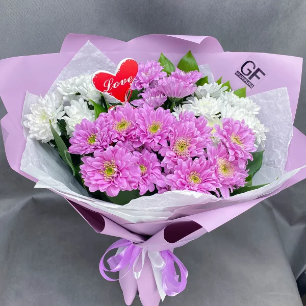 Букет "Неповторимая нежность" - название букета говорит само за себя! Этот букет из белых и розовых кустовых хризантем, который идеально подходит для создания атмосферы любви и нежности. Белые и розовые хризантемы создают сочетание нежности и свежести, которое идеально подходит для предложения руки и сердца и как подарок на любой случай. Цветы красиво собраны и оформлены в белую упаковку, что делает букет еще более элегантным и нежным. Такой букет - это идеальный вариант для тех, кто хочет выразить свои чувства и признаться в любви.