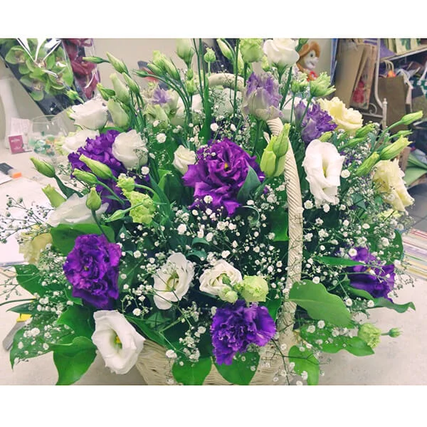 Нежное сочетание белых и сиреневых эустом выигрышно подчеркивает гипсофила и декоративная зелень. Букет, помещенный в изящную корзину, станет безупречным решением для вручения дорогому человеку на праздник.